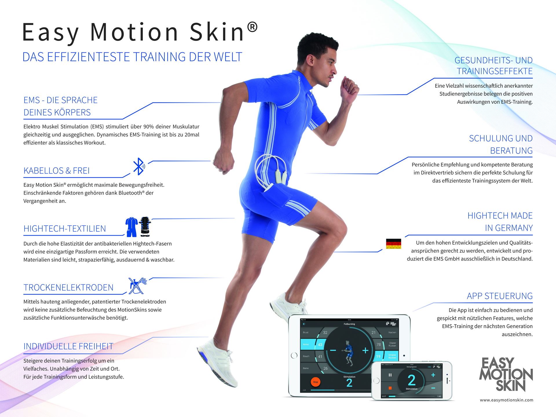 So einfach wie noch nie können Sie heute EMS-Training jederzeit und überall durchführen. Das System verstärkt durch fein adjustierbare Impulse jeglichen Trainingsreiz und ermöglich das effizienteste Workout dieser Zeit. Eine absolute Innovation sind die Trainingskonzepte, welche mit Easy Motion Skin® möglich werden. Mit diesem EMS-System kann jeder zu Hause vollwertiges EMS-Training machen, dieses aber auch mit in den Urlaub, auf Reisen oder in das Studio seiner Wahl mitnehmen und Trainieren wie die Profis.