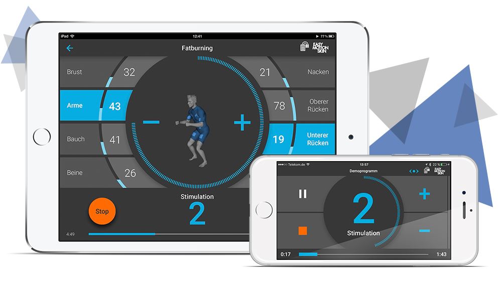Die Steuerung des EMS-Trainings mit dem Easy Motion Skin® wird dank der intuitiven Bedienoberfläche der iPad & iPhone App zur Leichtigkeit. Vom Login bis zum Trainingsende ist die App auf das Wesentliche fokussiert und einfach zu adjustieren.